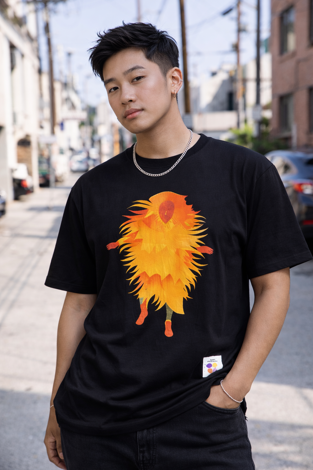 A bold black tee featuring a striking orange mask-inspired graphic with fiery layered textures. Designed to stand out while keeping your everyday style effortless and comfortable.